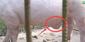 脐疝:脐部出现由小到大的局限性、半球形、柔软无痛性肿胀,大小可由核桃大至拳头大。肿胀会随日龄增大而增大,当仔猪仰卧或以手按压疝囊时,肿胀可缩小或消失,并可摸到脐孔。若发生嵌顿,则肿胀硬固,有热痛,病猪表现腹痛不安,有时呕吐。