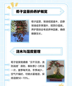 可通过扦插(梅雨季嫩枝易活)、播种或山野采挖老桩繁殖。扦插苗1-2年可上盆造型。通过以上养护,栒子盆景可展现四季不同的观赏价值,如初夏粉花、秋冬红果及红叶。注意根据南北气候差异调整管理细节,如北方冬季需防寒保护。