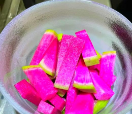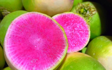心里美萝卜,外皮呈绿色,里面呈鲜艳的玫红色,颜色非常漂亮,由此而得名。其皮薄肉脆、多汁,多以凉拌食用,有生津止渴的作用。所含热量较少,纤维素较多,吃后易产生饱胀感,有助于减肥。具有下气、消食、除疾润肺、解毒生津、利尿通便的功效。
