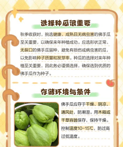 佛手瓜种子可以储存在罐子或沙子中。存放时,需要将环境温度控制在5-10度之间,然后将装有佛手瓜的容器放在阴凉通风的环境中。初霜到来后,还需要用烟灰和稻草盖在佛手瓜上保暖。