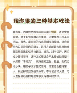 释迦果可以制作成果汁、果泥、果干进行食用。释迦果营养丰富,含有多种维生素、蛋白质、脂肪、糖类、钙、铁、磷等人体必需的营养物质,还含有一种能抑制血小板凝集的天然物质,可以辅助预防心脑血管疾病。