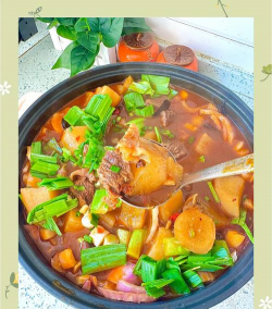 材料:南姜4片、牛肉丸6个、胸口朥300g、盐20g、沙茶酱50g、蒜末10g、芹菜末、黄豆酱50g、牛舌150g、五花腱150g、吊龙100g、肥胼100g、粿条100g、蔬菜200g。
