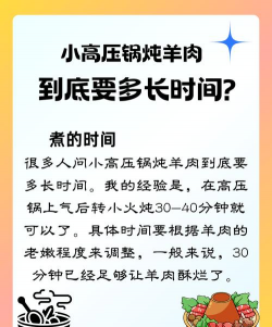 高压锅炖羊肉需要30分钟左右,用高压锅炖羊肉,开火后2分钟内开始冒气,持续冒气20分钟转小火慢炖几分钟就能炖熟了。用高压锅炖羊肉能更快速的将羊肉炖烂,且它结构密封,能最大程度的将羊肉的香味保留在汤汁里,避免香味散发出去,提升口感。