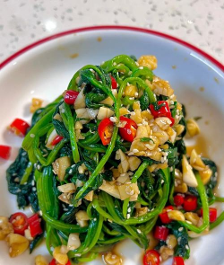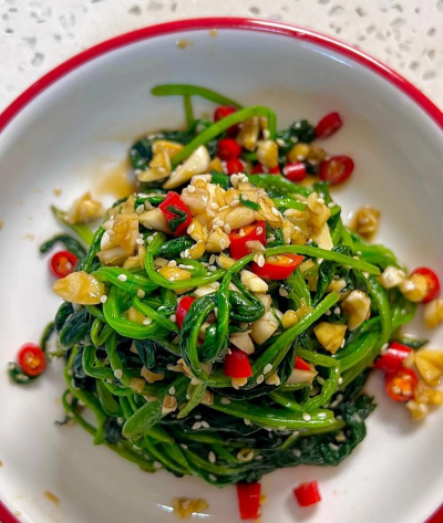 等芝麻被翻炒到颜色发黄的时候捞出芝麻,将炸好的油淋在调好味的菠菜上,这样一份美味的凉拌菠菜就完成了。如果想要凉拌菠菜的味道有更加丰富的层次的话,我们还可以往菠菜中加入一些花生碎。