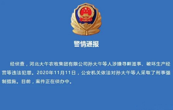 2020年11月11日,河北省高碑店市公安局通报称,孙大午及其公司高层因涉嫌“寻衅滋事、破坏生产经营”等罪名被采取刑事强制措施。警方通报未透露具体细节,但据多方报道,此事可能与大午集团与徐水国营农场之间的长期土地纠纷有关。双方因土地确权问题多次爆发冲突,包括2020年6月和8月的两次肢体冲突,甚至导致大午集团员工受伤和被拘捕。