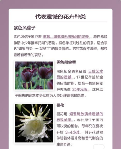 1、紫鸢花,常将紫鸢花比作痴情的女子。2、桔梗花,花色以蓝紫色为主,根茎肥大呈圆柱形,3、彼岸花,被形容为灾难、死亡与分离的不祥之美。4、昙花,给人一种十分遗憾、凄美的感觉。5、双生花,适合送给对感情充满遗憾的前任。