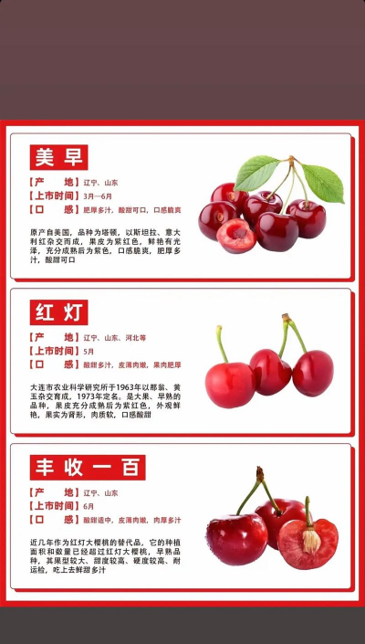 佳红大樱桃属于樱桃新品种类,成熟期较晚,生长周期较长,生长期呈深红色,完全成熟后会变成紫红色,颜色越深则果实越熟。果实较其他种类大一些,个头又大又圆,果皮光滑且有光泽,汁水充足,果肉厚实,甜度较高,有着丰富的营养物质,如维生素A、蛋白质、钙等。