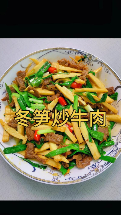 猪肉变色之后,加入冬笋,再加少量盐一起翻炒2分钟左右,冬笋不容易熟,所以在炒的时候要尽量多炒一会,接着加入青椒继续翻炒,在出锅加入硬币大小蚝油上色,炒匀后即可出锅。