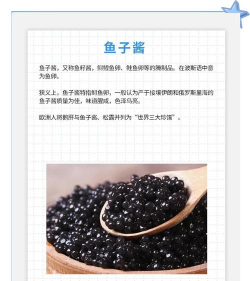 鱼子酱又称鱼籽酱,鲟鳇鱼卵、鲑鱼卵等的腌制品。狭义上来讲,只有鲟鱼的鱼卵才能制作成鱼子酱。鱼子酱,呈圆润饱满的颗粒状,入口破裂时味道腥咸,因其稀少的产量和乌亮的色泽而被誉为“黑色黄金”。能被用作生产鱼子酱的鲟鱼只有3种:大白鲟、奥西特拉鲟、闪光鲟。