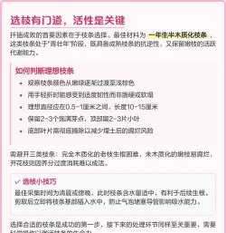 剪取花枝时间:春季或秋季的早晨或者傍晚进行。选好花枝:选健康、粗壮的花枝,剪取花枝的长度通常在6-10厘米之间。种植花枝的准备:要选择排水良好、土质疏松的扦插基质。要选择一个适宜的种植位置避免阳光直射和风吹雨打。水分和养分的供应:要及时给花枝补充水分和养分。