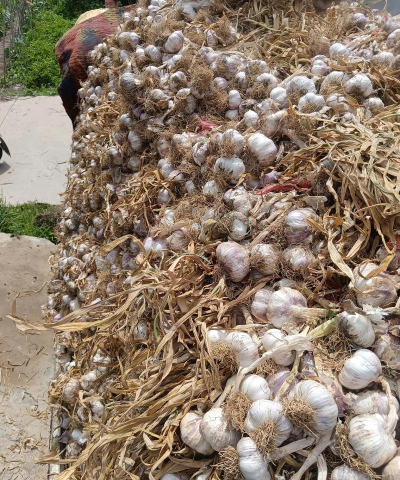6、收获与贮藏:蒜头在土壤中生长、膨大,当蒜叶枯黄、假茎松软时即可收获。收获后的大蒜应晾晒干燥,并存放在干燥通风的地方,防止受潮和霉变。