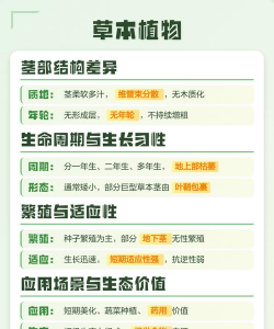 草本植物:生命周期较短,分为一年生(如玉米)、二年生(如冬小麦)或多年生(如菊花)。多数草本地上部分在生长季结束后枯萎,仅地下部分存活。