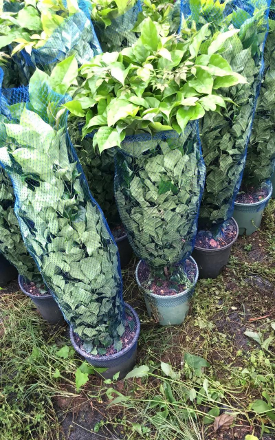 在不影响整体造型的前提下,对过长或脆弱的枝条进行捆扎,缩小体积以避免运输中折断。短途运输时,枝条恢复较快,影响较小。