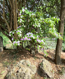 双色茉莉,又名鸳鸯茉莉、五色茉莉、番茉莉。由于开花有先后,在同一植株上同时能看到不同颜色的花,故得名“双色茉莉”,其英文名之意为“昨天、今天、明天”,这形象地描绘出其花色的特殊变化。小花初开时深蓝色,后变为浅紫色,最后变成白色。