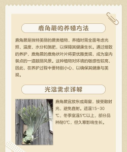 鹿角蕨怕直射阳光,因此在明亮的室内窗前附近生长良好。在温室栽培时,夏季应遮去50%~70%的阳光,冬季遮去30%左右比较适合。虽然鹿角蕨对弱的光线也有较强的适应能力,但光线不足时会导致生长缓慢、植株纤弱。因此,在养护过程中要注意保持适宜的光照强度。此外,鹿角蕨的生长温度也是一个需要注意的因素。夜间温度应保持在10~15℃,白天温度控制在20~25℃之间。在白天温度达到33~35℃的环境中也能生长良好,但此时湿度必须很大。在原产地,鹿角蕨有时能抵抗零下几度的低温而不受害,但这需要在非常干燥的环境下才能实现。
