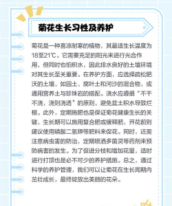 合理的水肥管理对菊花的花期调节同样重要,在生长过程中,要保持土壤湿润,避免过干或过湿,根据菊花的生长阶段和需要,适时施肥,为其提供充足的营养。特别是在花芽分化期和开花期,应增加磷钾肥的施用,以促进花芽的形成和开花。