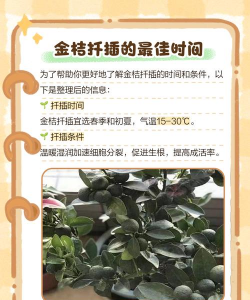 扦插繁殖也是金橘繁殖的有效方法,扦插繁殖时,应选择生长健壮、无病虫害的金橘枝条作为插穗。插穗的长度一般在10~15厘米之间,保留2~3个芽眼。扦插前,可以将插穗浸泡在生根粉溶液中,以提高生根率。然后,将插穗插入湿润的沙质土壤中,深度约为插穗长度的1/3。扦插后,要保持土壤湿润,避免阳光直射,并适时施肥,以促进插穗生根和生长。