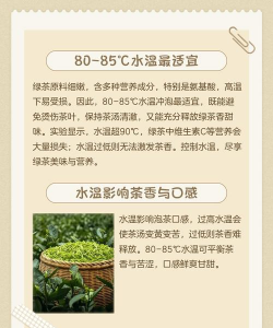 泡绿茶的水温一般控制在80℃到90℃之间。新制成的绿茶用80℃的水温冲泡,存放1年的绿茶用90℃的水温冲泡。叶片宽大的绿茶冲泡水温在85℃左右,纤细的80℃较为合适。喝绿茶有什么好处1.抗氧化与延缓衰老:绿茶含有丰富的抗氧化剂,特别是儿茶素