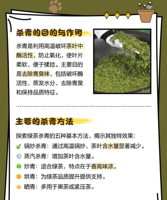 杀青主要是通过高温破坏和钝化鲜叶中的氧化酶活性,抑制鲜叶中的茶多酚等的酶促氧化,蒸发鲜叶部分水分,使茶叶变软,便于揉捻成形,同时散发青臭味,促进良好香气的形成。这是茶叶形状和品质形成的关键工序,对茶叶的品质有决定性的影响。