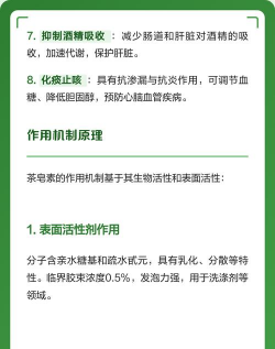 茶皂素具有明显的抗渗漏与抗炎症特征,可用于调节血糖、降低胆固醇、预防心脑血管疾病,有化痰止咳等功效。茶皂素还能抑制肠道、肝脏对酒精的吸收,促进体内酒精的排泄,对肝脏有保护作用。
