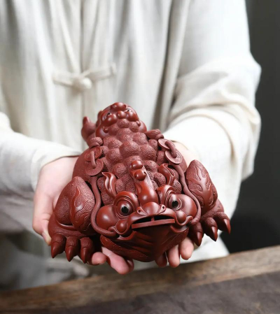 有些金蟾茶宠经过热茶水的滋养,颜色会发生变化,如金色、绿色、红色等,这些变化都被视为如意吉祥的征兆。同时,霸气且带有开光灵性的金蟾,也代表着辟邪、好运和幸福。