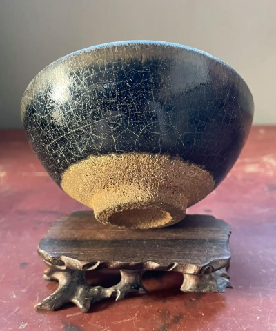 建盏的胎骨厚实,且含铁量高,因而其黑色底釉上会浮现自然形成的铁系结晶斑,且叩之有金属声。