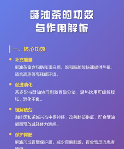 4、延缓衰老:酥油茶里的蛋白质、脂肪以及多种对人体有益的氨基酸和微量元素,能加快人体新陈代谢,促进细胞再生,防止过氧化脂质在体内过度堆积,从而延缓衰老。