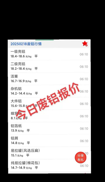 3.破碎生铝(91-93%):15900-16100元/吨。这相当于约0.80-0.81元/斤。