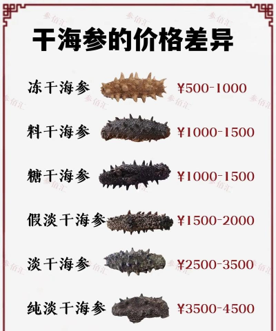 干海参有很多种,例如,野生纯淡干海参一般价格在2000-5000块钱一斤不等,高端一点的海参店可能要卖到这个8000-10000块钱一斤;老淡干海参在1500-3000块钱左右一斤;盐干海参一般在1000-2000块钱左右一斤;糖干海参一般在800-1600块钱左右;野生即食海参市场价一般是在180-500块钱左右一斤;免发海参一般不添加任何东西的市场价大概在3000-3500块钱左右一斤;半干海参的市场价在500-1800块一斤。