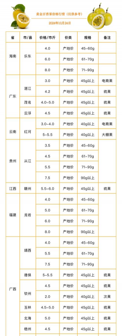 其他地区:江西赣州市寻乌县百香果8.74元/斤;海南三亚市海棠区百香果13元/斤。