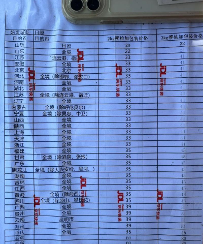 辽宁省:辽宁大连市中山区樱桃6元/斤;辽宁大连市旅顺口区樱桃15元/斤;辽宁大连市瓦房店市樱桃25元/斤;辽宁大连市金州区樱桃15元/斤;辽宁葫芦岛市绥中县樱桃20元/斤。
