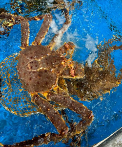 蓝帝王蟹的壳体呈蓝色,体型比阿拉斯加帝王蟹稍小,但同样肉质鲜美,主要分布在俄罗斯远东地区。