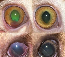 虹膜和睫状体的炎症(前葡萄膜炎或虹膜睫状体炎)严重时,会导致眼睛瞳孔收缩,前房蛋白质和细胞增加,眼睛内压力低,结膜血液水平异常高,虹膜肿胀,对光的耐受性低,以及痉挛性眨眼。因此,可能会出现并发症,如青光眼、覆盖眼睛晶状体的白内障形成和角膜浑浊。视网膜和眼睛白色部分之间的膜的炎症经常同时发生。