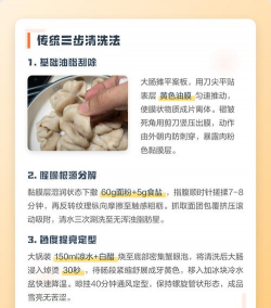 揉搓过程中,要注意将猪肠内壁的每个角落都清洗干净,避免遗漏。揉搓完毕后,用清水冲洗干净,确保没有面粉和油残留。最后,用淘米水对猪肠进行再次清洗,以去除残留的异味和杂质。