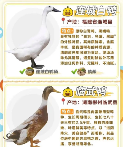 步态和声音:公鸭在行走时步态高昂,腹部微微抬起,并伴有轻微的“嘎嘎”声;母鸭则相对安静,步态平稳。公鸭的叫声较为粗犷、响亮,母鸭的叫声则相对柔和、细腻。
