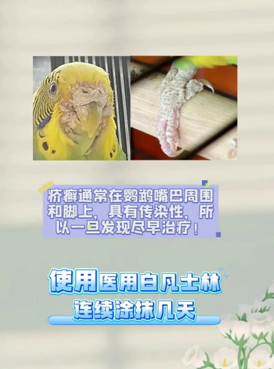 鳞片状面部或腿部螨虫在虎皮鹦鹉中很常见,但在其他鹦鹉中很少见。螨虫会在受影响鸟类的面部或腿部引起类似疥癣的症状。感染的迹象包括嘴角、鼻孔、喙周围的白色结痂,偶尔还有眼睛或腿周围的区域,如果不治疗,可能会导致畸形。即使治疗成功,喙畸形仍可能持续存在。其他种类的鸟类,如金丝雀和雀类,也可能感染这种寄生虫,但有不同的迹象,例如在腿和脚趾表面形成的外壳。瘙痒通常不常见。螨虫可以从受影响地区的皮肤刮片中诊断出来。兽医很可能会开一种口服或注射的抗寄生虫药物。