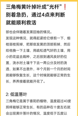 先观察叶片脱落的具体表现(如黄叶部位、盆土状态等),结合近期养护操作(换盆、施肥等)逐一排查原因。多数情况下,调整光照、控水、保温后,植株可在1-2周内恢复。