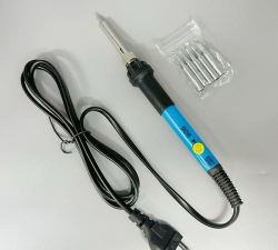 外热式电烙铁由烙铁头、烙铁芯、外壳、木柄、电源引线、插头等部分组成。由于烙铁头安装在烙铁芯里面,故称为外热式电烙铁。烙铁芯是电烙铁的关键部件,它是将电热丝平行地绕制在一根空心瓷管上构成,中间的云母片绝缘,并引出两根导线与220V交流电源连接。外热式电烙铁的规格很多,常用的有25W、45W、75W、100W等,功率越大烙铁头的温度也就越高。