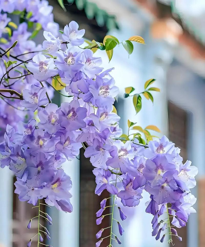 蒜香藤:深秋开紫色花,初开时花色鲜艳,后期逐渐变色。