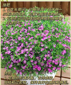 温度:生长适温15-25℃,高温(>30℃)或低温(<10℃)均会抑制生长。满天星的生长周期因播种季节而异,春季播种约3-5个月完成,秋播则需跨年。其生命力强,但需注意防治积水导致的根腐病和高温引发的病虫害。