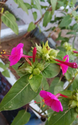 开花时间:傍晚开放(约下午4点至次日上午),故称“四点钟花”,与传粉昆虫(如天蛾)活动时间吻合。紫茉莉以其多样的花色、实用的功能及独特的生态行为成为兼具观赏与实用价值的植物,但需注意其入侵性和毒性。