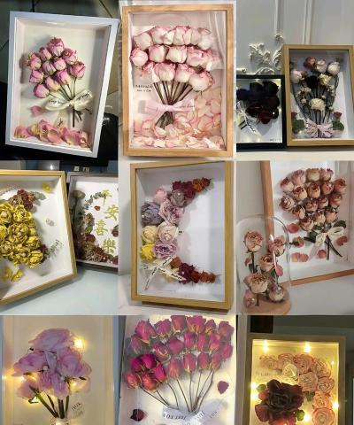 玫瑰:半开状态的玫瑰风干后形态最佳,颜色会略微加深(如红色变黑紫色),但层次感强,适合倒挂风干或微波炉烘干。