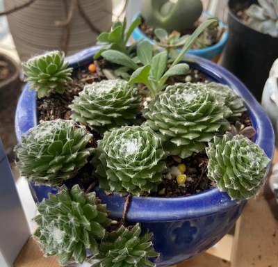 草莓卷娟 :叶排列紧密,叶尖有白毛,生长适温10-25℃,常用分株繁殖。