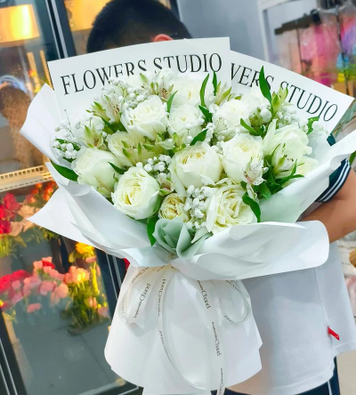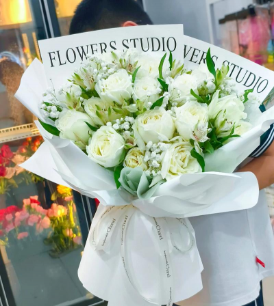 白玫瑰与绿色花材的组合能营造清新自然的氛围,适合生日、表白、毕业等场合。