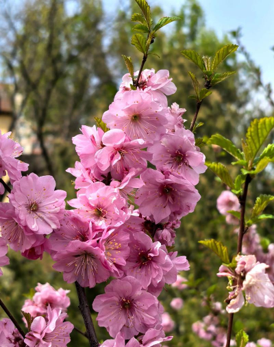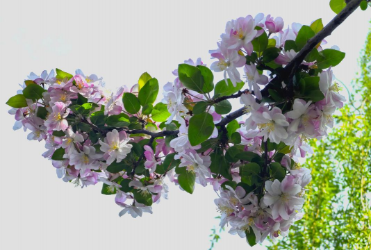 特点:品种多样,如西府海棠(花朵朝上)、垂丝海棠(花朵下垂)、贴梗海棠(无花柄)。花色从粉红到白色,花后结小果。