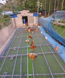 鸡舍入口设消毒池,周边挖排水沟,高度差0.2-0.3米,防止疫病传播。