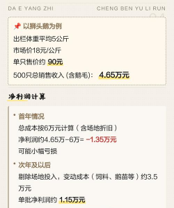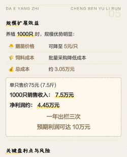 初期投入:包括鹅苗(8-20元/只)、饲料(25-30斤/只,约1.5元/斤)、设备(大棚建设约1-2万元)等,1000只总成本约7.4-9.7万元。