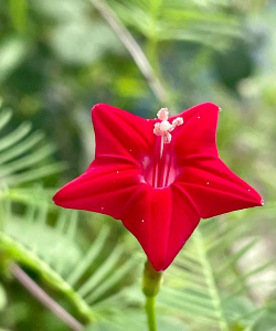 茑萝(五角星花):旋花科植物,深红色星形花朵,适合攀援装饰。