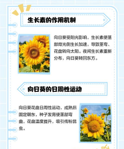 向日葵向日葵是最著名的向日植物,其幼株顶端和未成熟的花盘会随太阳从东向西转动,夜间又缓慢转回东方。这一现象由生长素分布调控,背光侧细胞生长更快导致茎弯曲。成熟后,花盘固定朝东以避免正午高温伤害花粉。