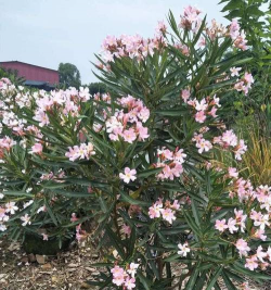 夹竹桃族夹竹桃属常绿直立大灌木,高可达5米,枝条灰绿色,嫩枝条具棱,被微毛,老时毛脱落。叶3-4枚轮生,叶面深绿,叶背浅绿色,中脉在叶面陷入,叶柄扁平,聚伞花序顶生,花冠深红色或粉红色,花冠为单瓣呈5裂时,其花冠为漏斗状,种子长圆形,花期几乎全年,夏秋为最盛;果期一般在冬春季,栽培很少结果。
